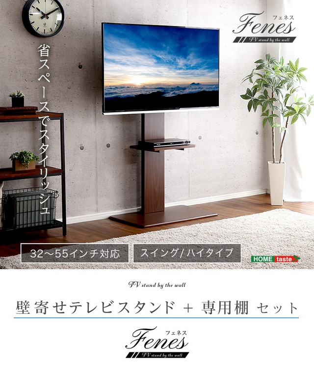 ●商品説明 生活スペースを取らない壁寄せテレビスタンド(スイングハイタイプ)!最大可動域240度のワイドスイング機能付き!取付けテレビは32~55インチまで対応可能。配線や電源タップを背面に収納でき、見た目が綺麗でスッキリ!震度7の耐震試験をクリア!専用棚とSETにしてお得になりました。 【専用棚の設置高さとピッチ】 ハイタイプ:10cmピッチで下台から約44cm、約54cm、約64cm、約74cmに設置できます。 【テレビ適応表】 http://www.hometaste.co.jp/shozaioh/wat_swat.pdf ご注文前に必ずテレビ適合表をご確認いただいた上で 注文をしていただきますよう、よろしくお願いいたします。 ※購入後にテレビが対応してなかったなどの理由で返品対応は出来かねます。 ※専用棚にレコーダーやゲーム機などを置いた際に専用棚が平行になるように少し上向きになるように 設計されております。商品の不具合ではございませんので予めご了承下さい。 ●サイズ 【商品サイズ】 テレビスタンド:約W75×D46.5×H118~168 棚:約W45×D30×H1.8cm 【商品重量】 テレビスタンド:約18.1㎏ 棚:約2.3㎏ 【梱包サイズ】 テレビスタンド:89×52×16cm 棚:47×34×6.5cm 【梱包重量】 テレビスタンド:約19.4㎏ 棚:約2.6㎏ ●カラー ブラック、ホワイト、ウォールナット ●素材 スチール/MDF ●その他 中国製、組み立て時間:1時間