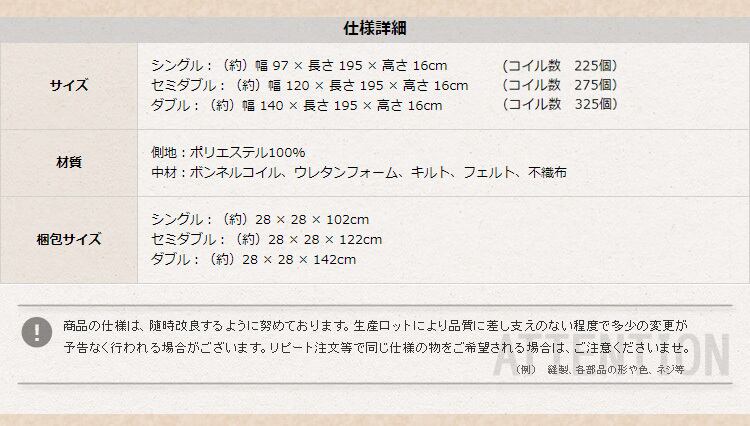 中材:ボンネルコイル、ウレタンフォーム、キルト、フェルト、不織布