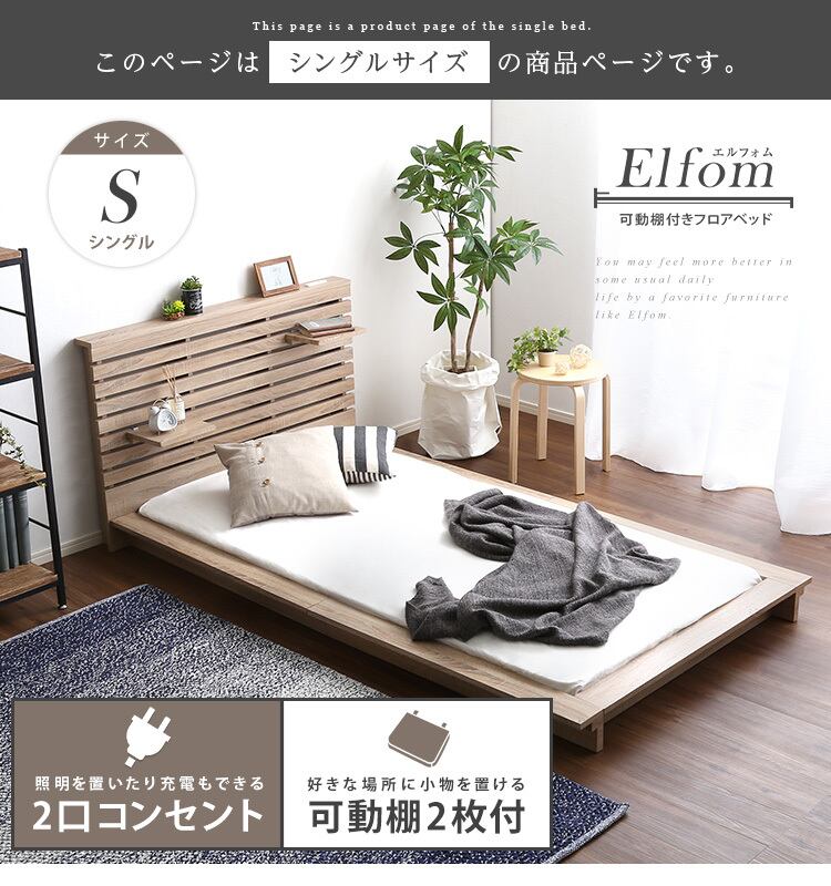 スリムなヘッドボードには2枚の可動棚をお好みの位置に配置可能!