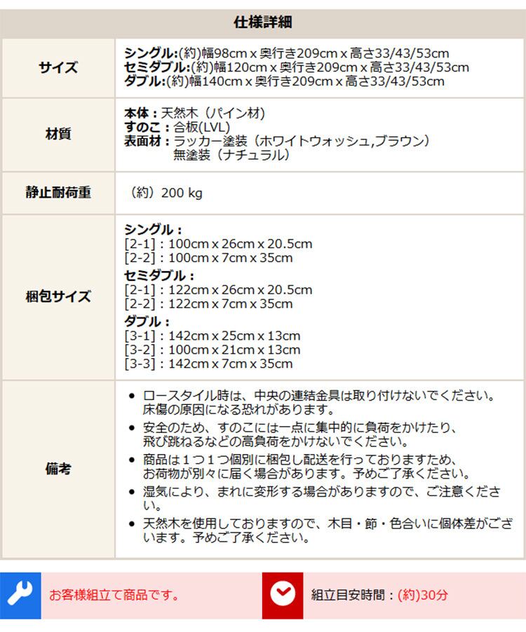 3段階に高さを調節できる宮セット脚付きすのこベッド。