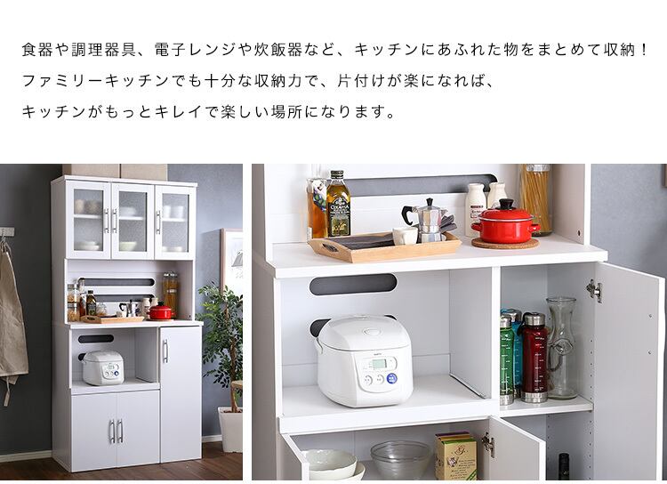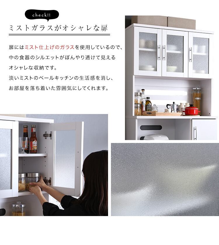 ・キッチン用品をたっぷり収納できる収納力抜群の食器棚!・高さ調整のできるガラス扉付き食器収納!