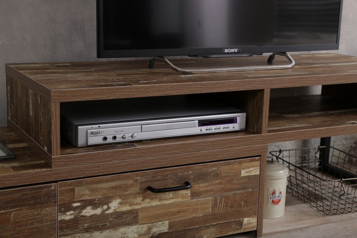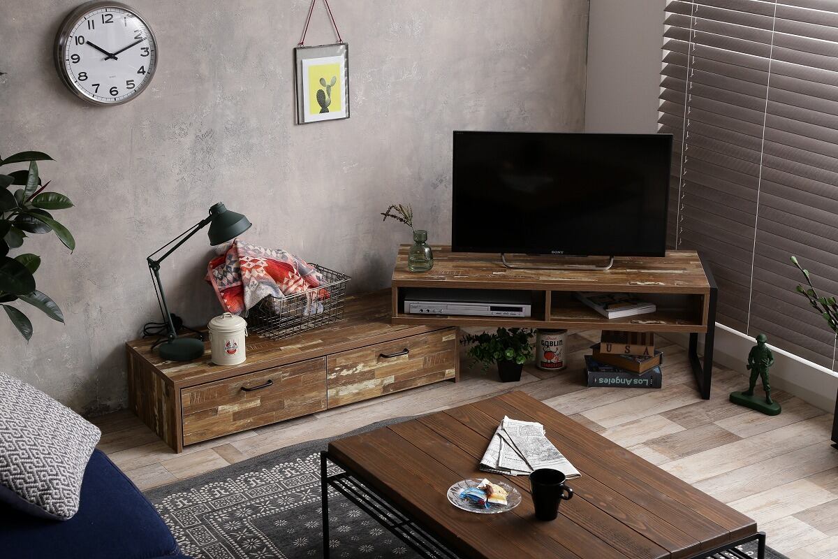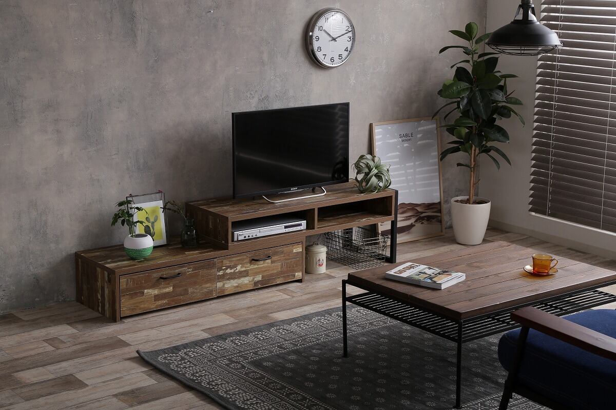 まるで古材を組み合わせたような寄木風の木目柄が魅力のAVボードです。ビンテージ風インテリアとの相性抜群で、落ち着きのある大人っぽい空間を演出してくれます。このAVボードの最大の特徴は、横幅の調整、角度の調整が自由にできることです。