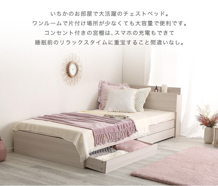 S・4カラー【ブラックオーク】【ベッドフレームのみ】大人かわいいインテリア 棚・コンセント付きチェストベッド シングル【anail-アネール-】