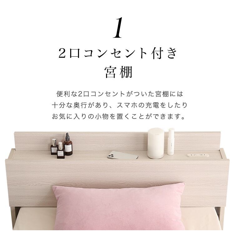 2口コンセントが付いた宮棚はスマホの充電やお気に入りの小物置きにピッタリ!