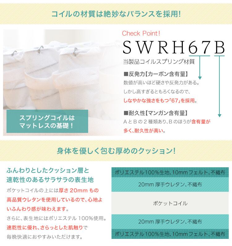 (マットレス)側地:ポリエステル100% 中材:ポケットコイル、ウレタンフォーム、フェルト、不織布