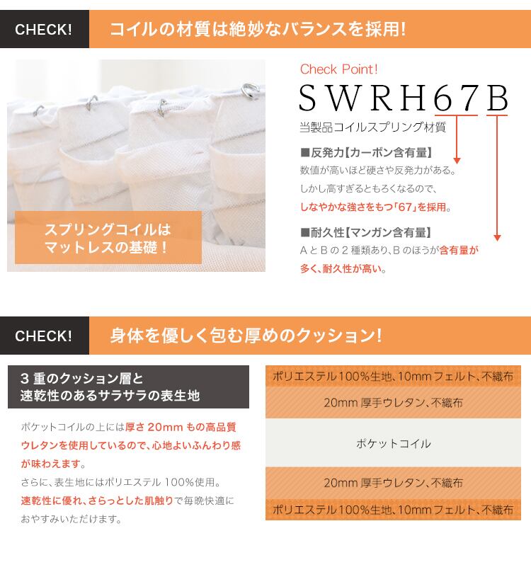 (マットレス)側地:ポリエステル100% 中材:ポケットコイル、ウレタンフォーム、フェルト、不織布