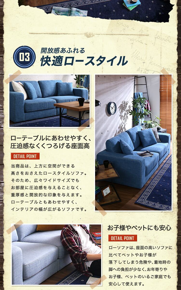 2.5人掛けデニム風フロアソファ(布地)同色のクッション2個付き お手入れ簡単|Brawl-ブラウル-