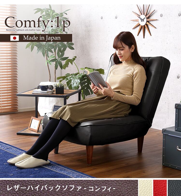 1人掛ハイバックソファ(PVCレザー)ローソファにも、ポケットコイル使用、3段階リクライニング 日本製|Comfy-コンフィ-