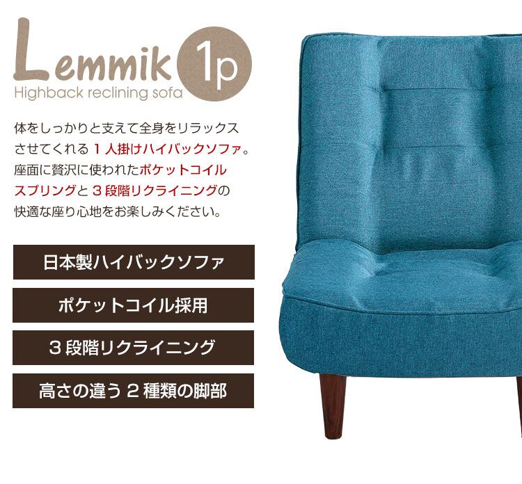 1人掛ハイバックソファ(布地)ローソファにも、ポケットコイル使用、3段階リクライニング 日本製|lemmik-レミック-