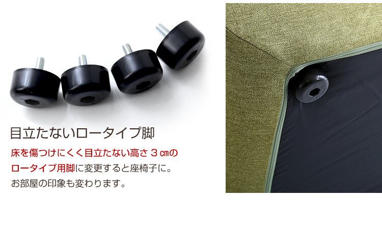 ハイタイプ木目調脚をロータイプ脚に取り換えれば座椅子としてもご利用いただけます。