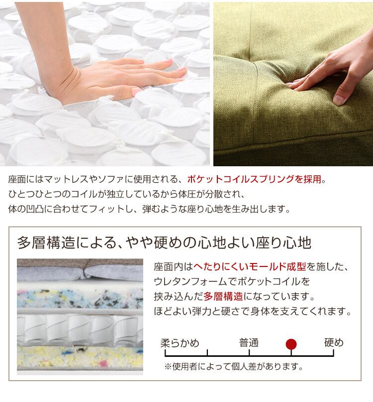 クッション材:ウレタン(モールド成型)、ポケットコイルスプリング