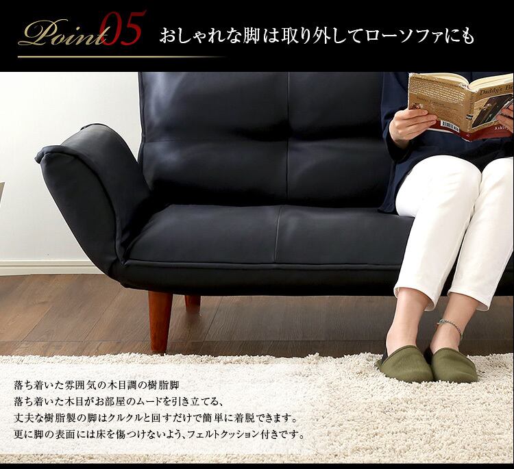 4カラー【ブラック】コンパクトカウチソファ【Rugano-ルガーノ-】(ポケットコイル リクライニング レザー風 日本製)