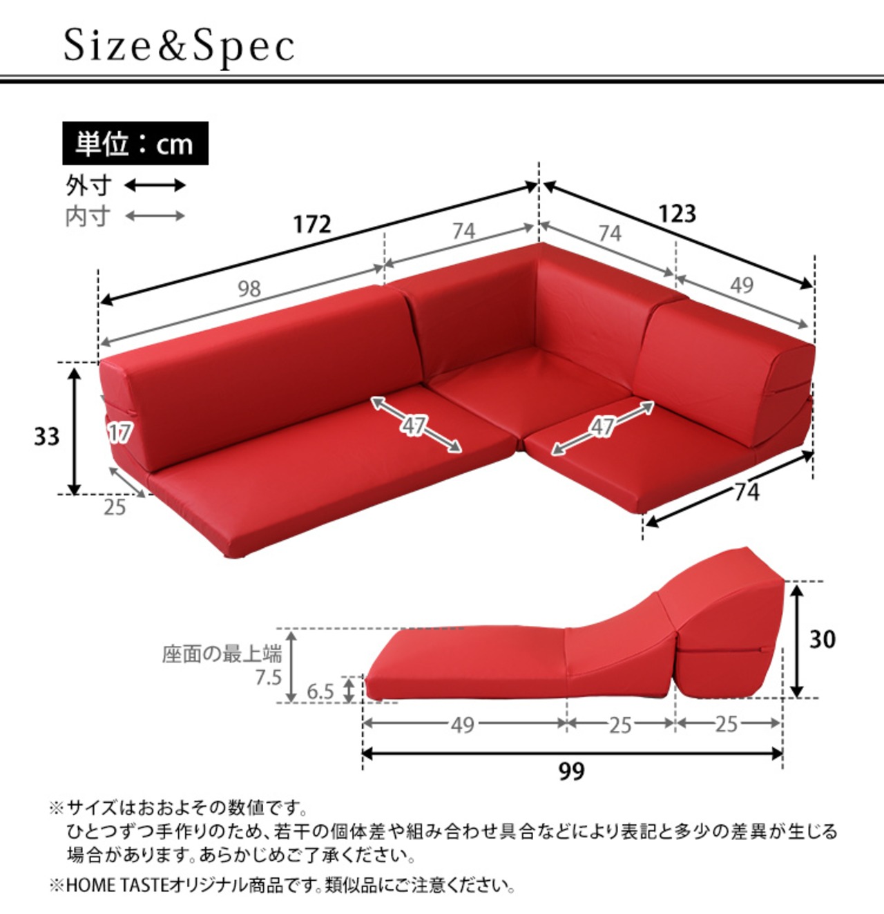 コーナー:(約)幅74x奥行き74x高さ33cm