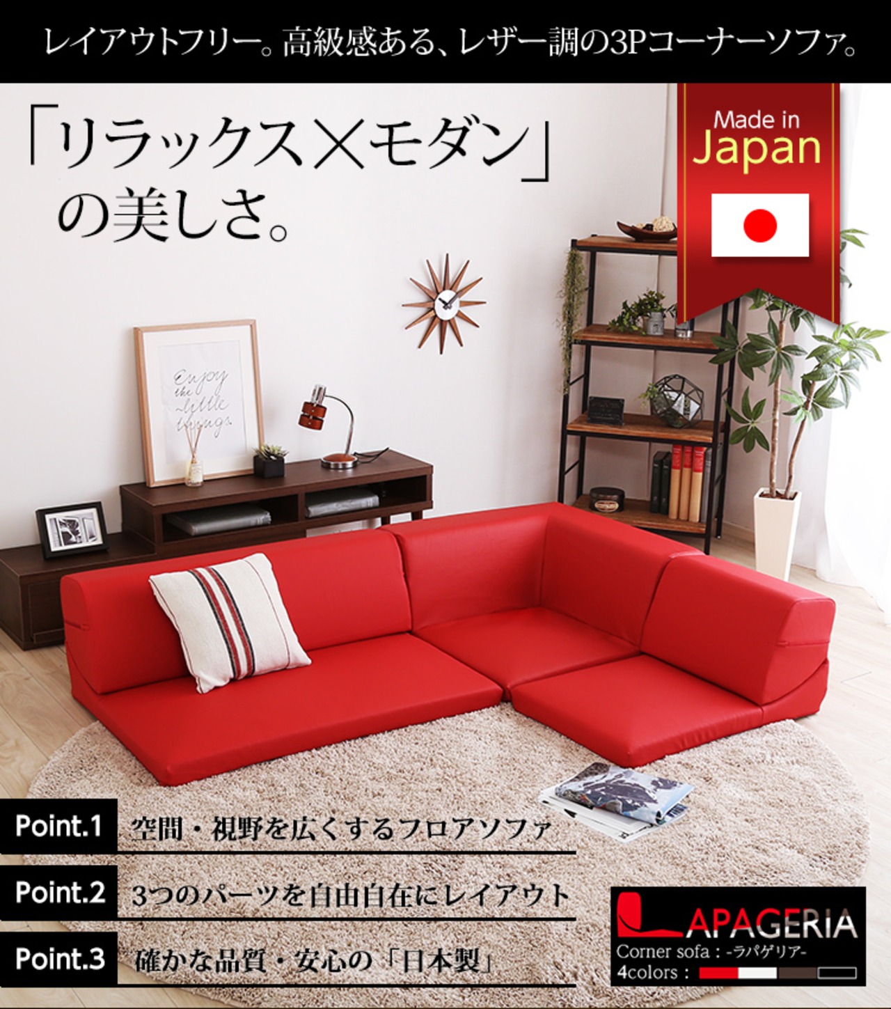 4カラー【レッド】ローコーナーソファ 【Lapageria-ラパゲリア-】 使い方自由自在 フロアソファ レザー調 くつろぎ コーナーソファ 3点 セット