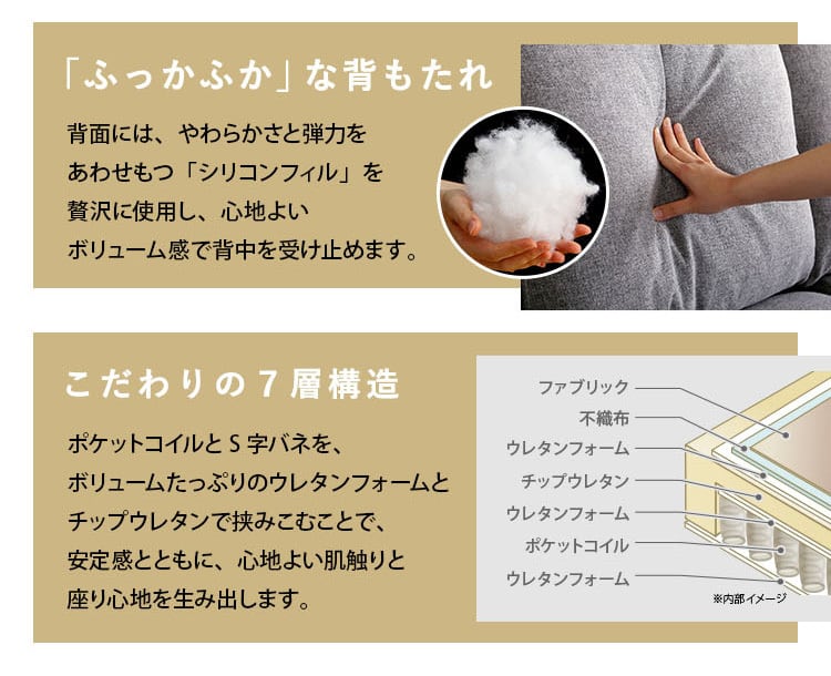 ポケットコイルとS字バネのWクッション採用で、しっかりとした弾力感のある座り心地。