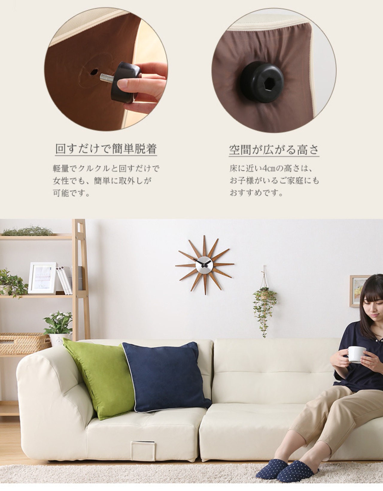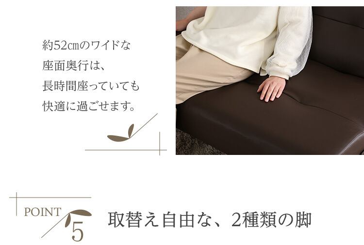 ゆったり座れるワイド設計と取替え自由な2種類の脚で、リビングライフの多様性に応える充実のソファです。
