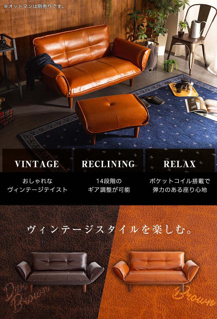 お部屋に置くだけでインパクトのあるヴィンテージカウチソファ!座面幅は約130~170cmのリクライニングができ、14段階のギア調整が可能。