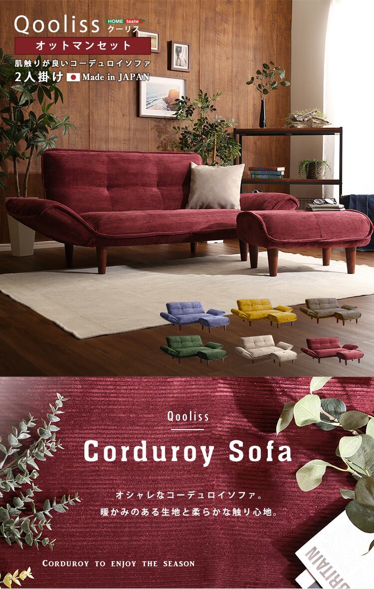 コーデュロイ生地で肌触りが気持ちい2人掛けコンパクトソファとオットマンのセット!