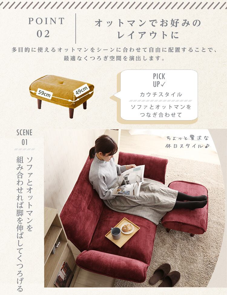 コーデュロイ生地で肌触りが気持ちい2人掛けコンパクトソファとオットマンのセット!