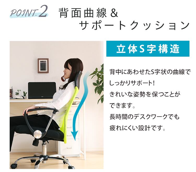 ハイバック仕様なので長時間の作業でも首や肩回りの負担を軽減。