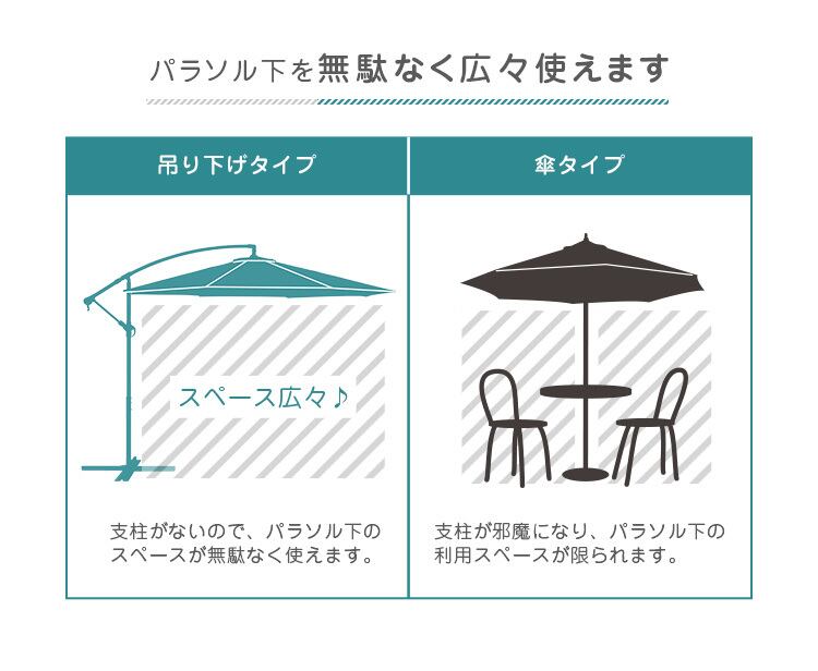 直径3mの傘でしっかりと日陰を作る事ができるパラソル!