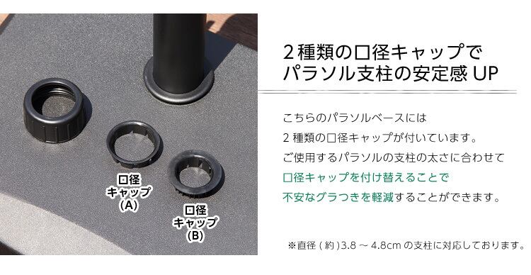 2種類の口径キャップでパラソルの柄をしっかり支えます!