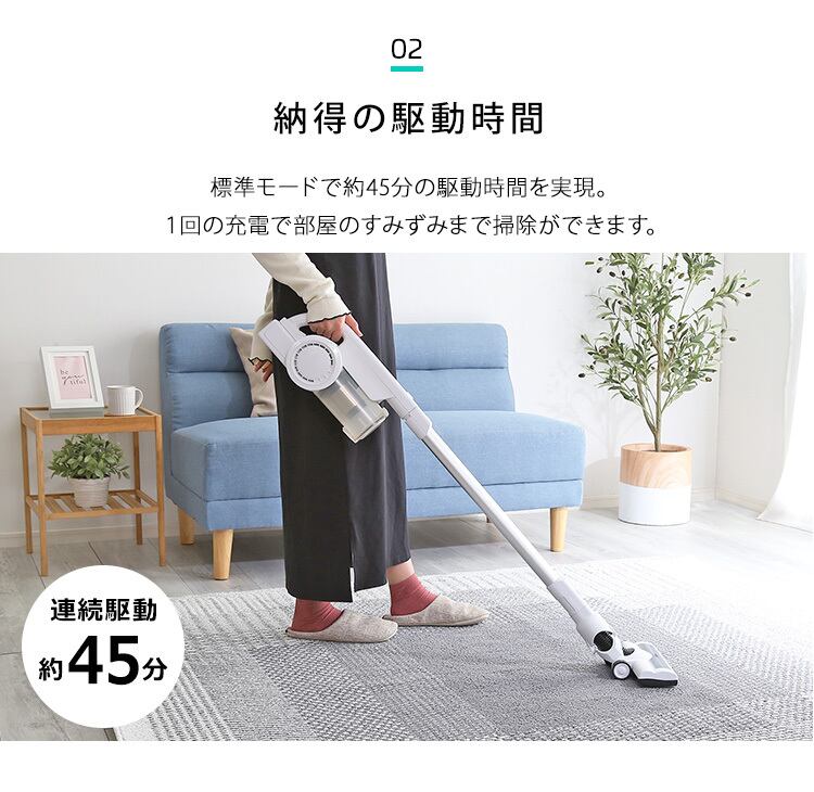 標準モードで約45分の駆動時間を実現。1回の充電で部屋のすみずみまで掃除ができます。