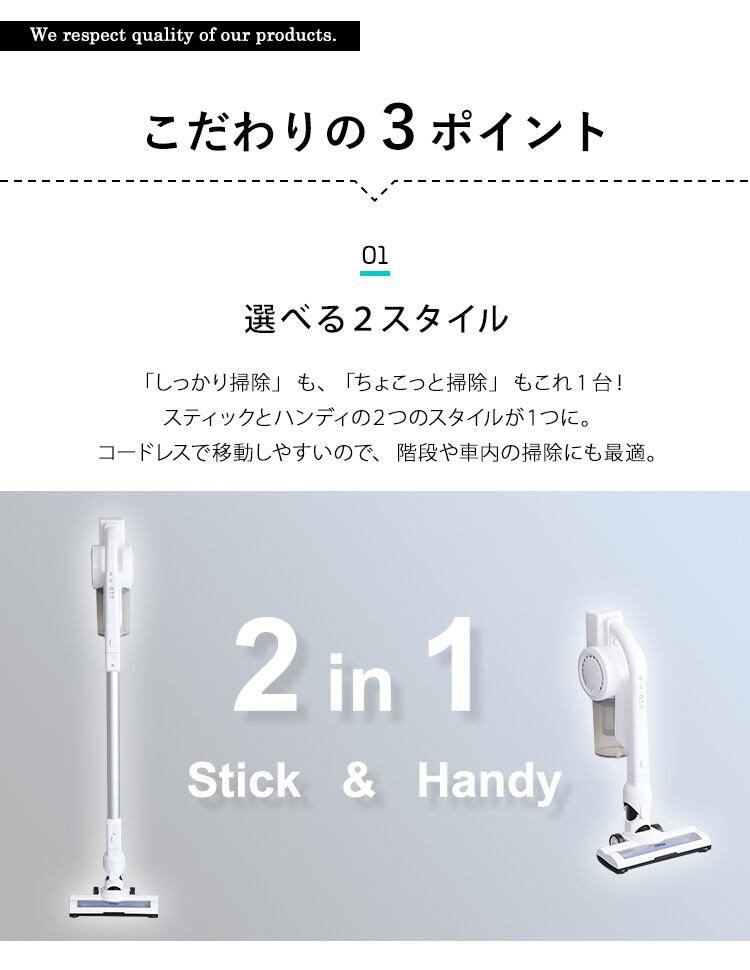 2カラー【ホワイト】充電式スティッククリーナー スティックとハンディ2way仕様