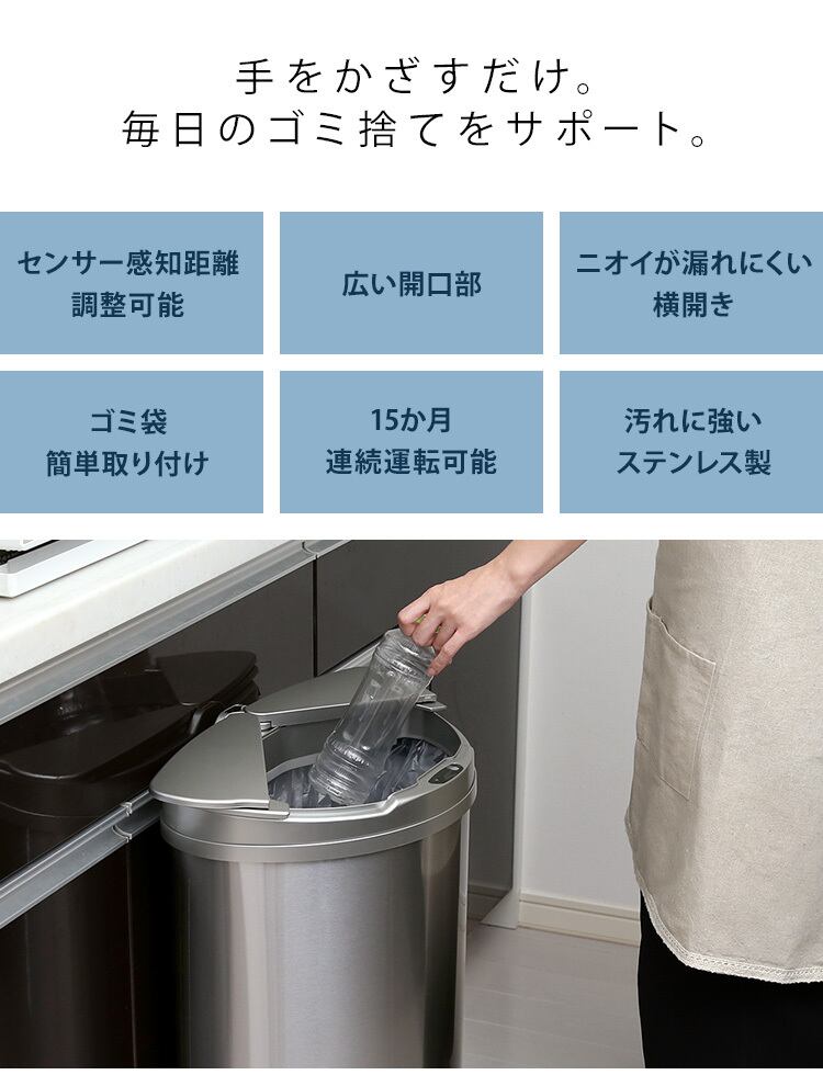 蓋が横開きなのでニオイが漏れにくく、ステンレス製なのでお手入れ楽々!