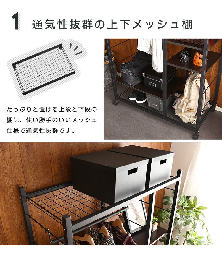 通気性抜群上下メッシュ棚・高さ調節可能ハンガーポール