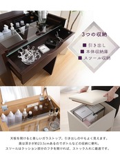 女性の憧れ!大容量収納のコンパクトドレッサー【rouge-ルージュ】!ドレッサーが欲しいけど、スペースに困る…という方にオススメです。リビングにも置けるコンパクトサイズ!その上、スツールとコンセント付きなので、その場でサッとお支度OK!ミラー付き天板を閉じればデスクとしても使えます。美しい木目調のホワイト、ナチュラル、ダークブラウンの3色からお選びください。