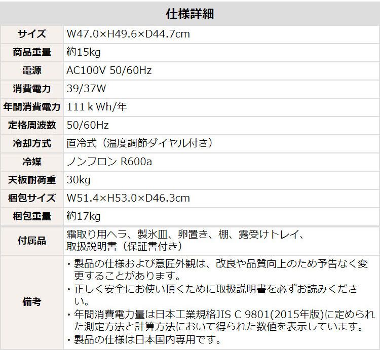 定格電圧:AC 100V、定格周波数:50/60Hz、年間消費電力量:111kWh/年(50/60Hz共通)、電源コード長:約1.8m、天板耐荷重:30kg、冷却方式:直冷式(温度調節ダイヤル付き)、冷媒:ノンフロン R600a