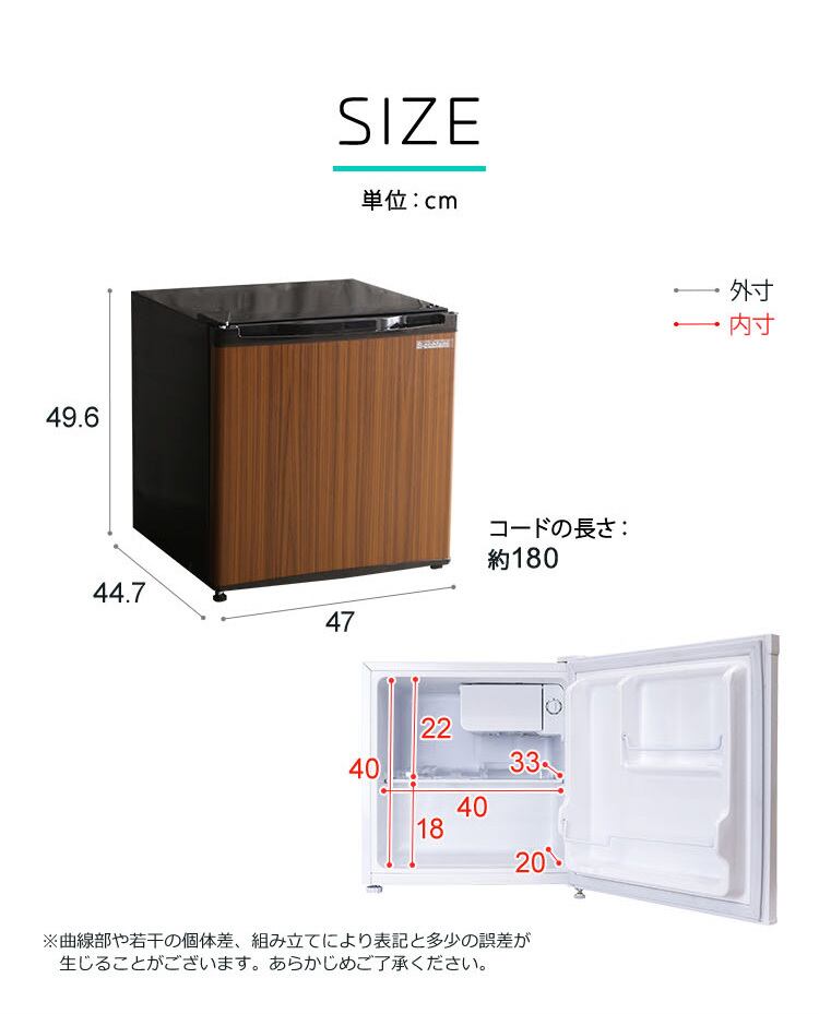 定格電圧:AC 100V、定格周波数:50/60Hz、年間消費電力量:111kWh/年(50/60Hz共通)、電源コード長:約1.8m、天板耐荷重:30kg、冷却方式:直冷式(温度調節ダイヤル付き)、冷媒:ノンフロン R600a