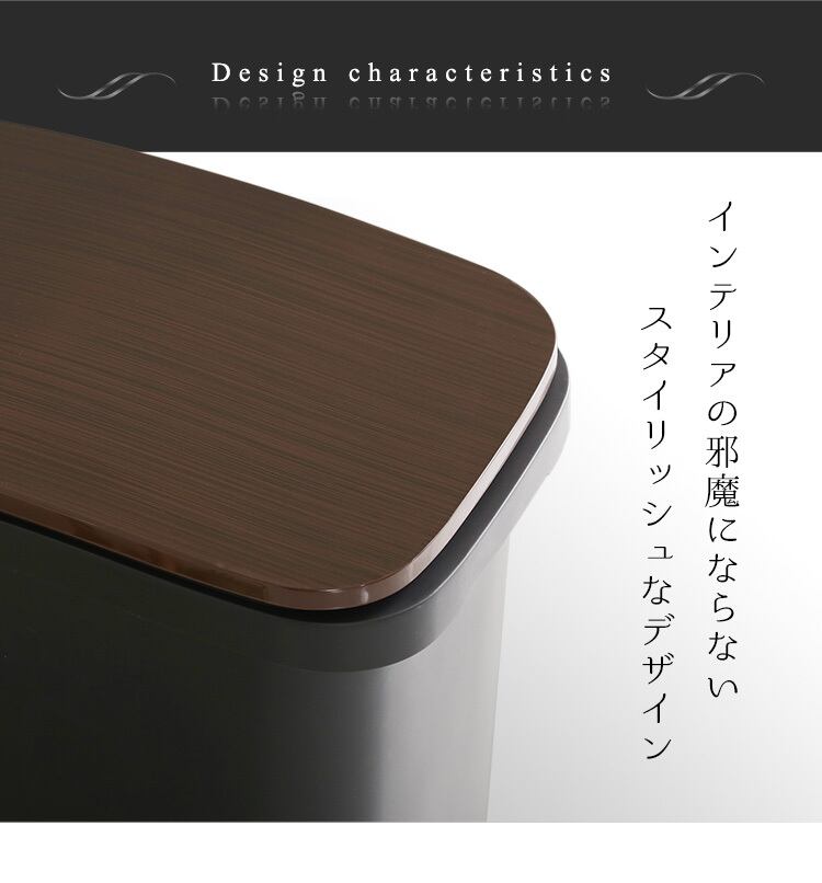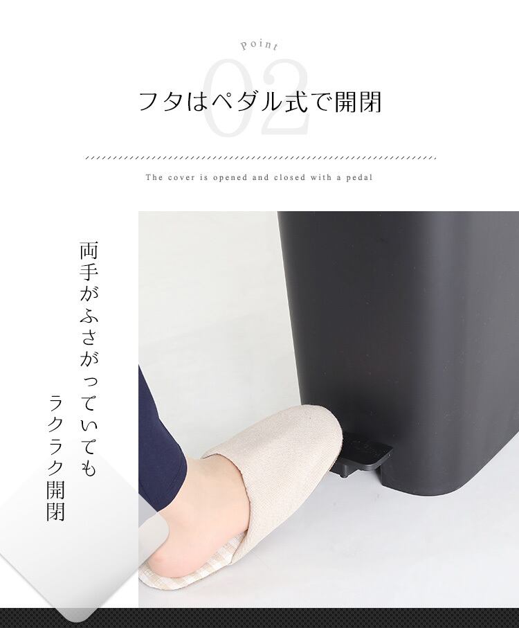 幅の狭いスリムな形状で、フタはペダル式で両手がふさがっていてもラクラク開閉!