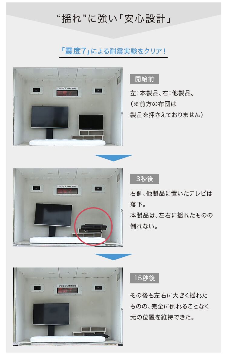 生活スペースを取らない壁寄せテレビスタンド(固定ロータイプ)!取付けテレビは32~60インチまで対応可能。配線や電源タップを背面に収納でき、見た目が綺麗でスッキリ!震度7の耐震試験をクリア!