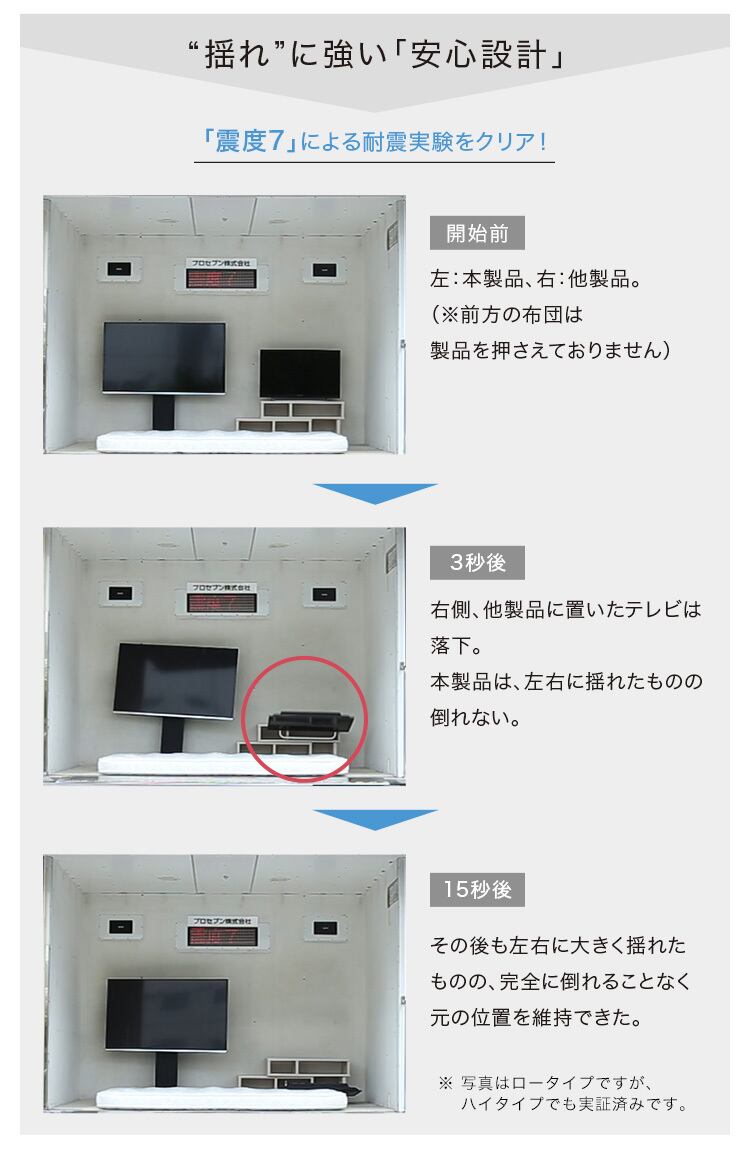 生活スペースを取らない壁寄せテレビスタンド(固定ハイタイプ)!取付けテレビは32~60インチまで対応可能。配線や電源タップを背面に収納でき、見た目が綺麗でスッキリ!震度7の耐震試験をクリア!サウンドバー専用棚とSETにしてお得になりました。